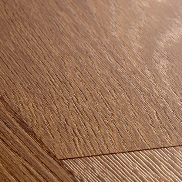 Quick-Step CLM – Mã màu CLM1381 – nổi bật với sắc nâu sồi trung bình ấm áp, với ánh vàng nhẹ và độ đậm vừa phải tạo cảm giác thân thiện mà vẫn sang trọng. Bề mặt có kết cấu vân gỗ rõ nét, hơi rustic với đường vát “impression bevel” ở 4 cạnh, làm nổi bật hiệu ứng tự nhiên và chiều sâu thị giác khi lát sàn.
